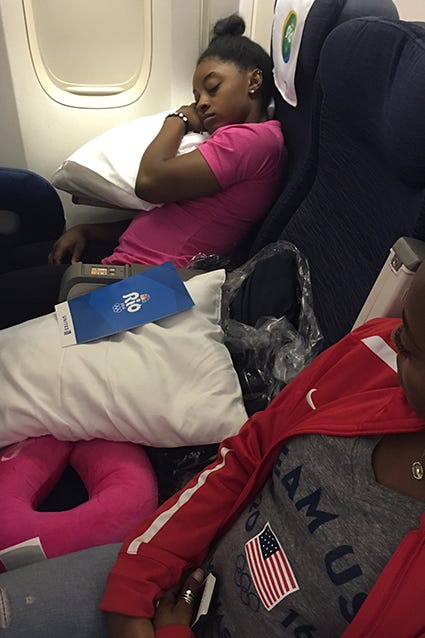 Can you blame Biles for taking a power nap on the long flight back to the States from Brazil? "Miss @simonebiles fell asleep before we took off. WHO'S THE GRANDMA NOW GUYS," Rasiman teased her teammate on Aug. 22.
