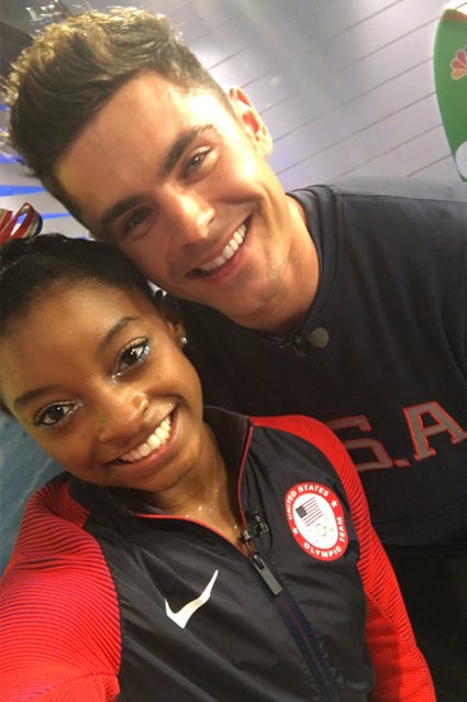 Sure, it's pretty nice to win an Olympic medal, but you know what's also awesome? Meeting Zac Efron! Biles is a megafan who has pronounced her love of the actor many times, and she finally got to meet the Neighbors 2 star when he surprised Team USA in Rio. "He kissed me on the cheek just letting y'all know," the gold gymnast proudly tweeted after their meeting on Aug. 16, adding lip and heart emojis.
