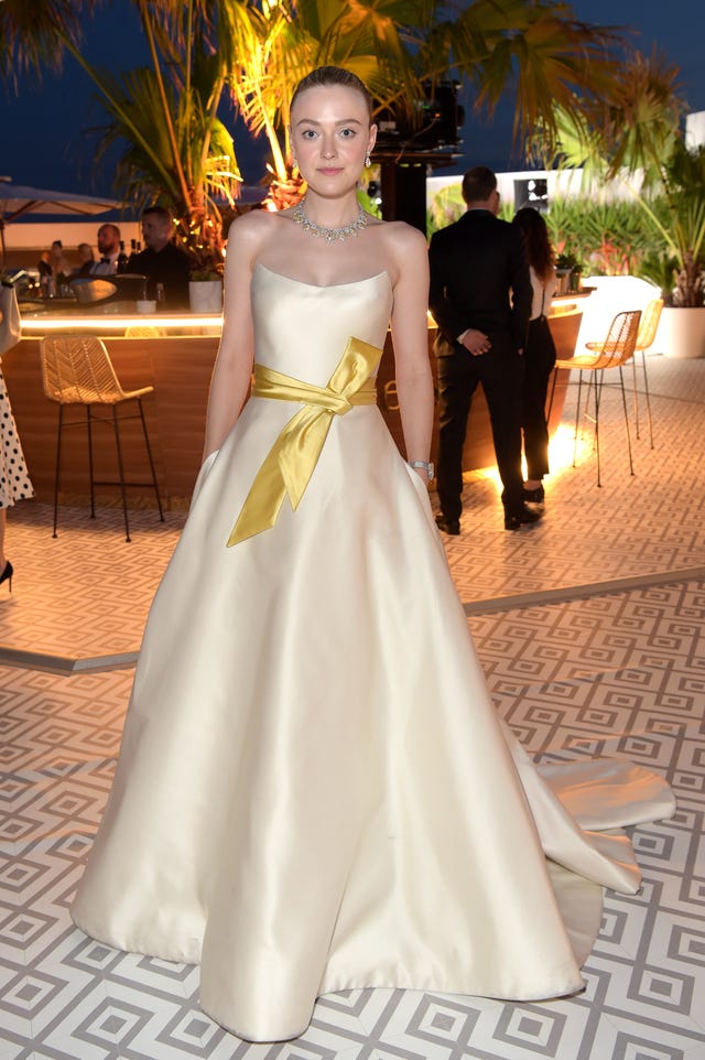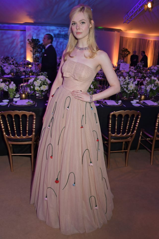 The Teen Spirit star wowed in a beige strapless Prada dress with floral detailing at the official Trophee Chopard dinner at Agora, but there was one tiny problem -- the gown was so tight, Fanning fainted!
