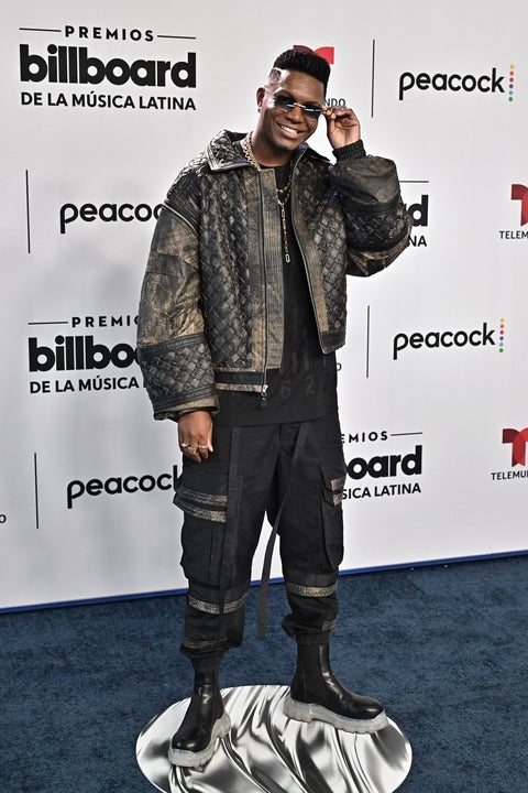 The singer and rapper rocks the carpet in all red at the Latin Billboard Music Awards.