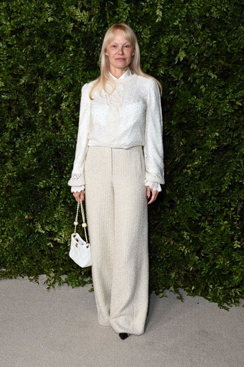 The actress opted for tweed pants and a white knit blouse with a Chanel bag, shoes, and accessories.