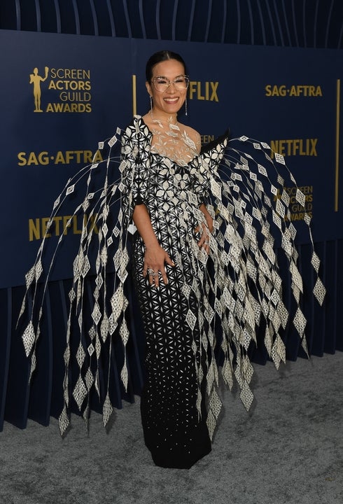 The Beef actress shows off her beauty look done by makeup artist Daniel Martin using Dior Beauty products and wears a fun dress to the SAG Awards in Los Angeles, California.