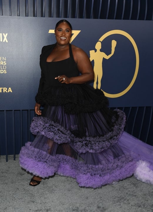 The Color Purple actress wears a stunning ruffle gown with purple hints of color on the carpet before the ceremony.