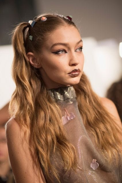 While walking the Fendi runway show during Milan Fashion Week in Italy on Sept. 22, Gigi Hadid put a trendy take on classic pigtails with bright hair accessories, winged eyeliner and glitter lipstick.