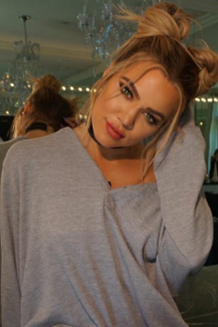 Always on-trend, Khloe Kardashian sported a middle part and two cute hair buns, styled by Joyce Bonelli, on Aug. 4. She completed her girly beauty look with a punchy pink pout and bronzed glow.