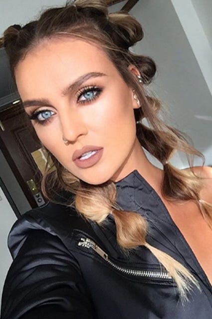 Little Mix's Perrie Edwards debuted a new hair trend on Nov. 18, sporting two pigtails -- teased and held together with clear elastic hair ties -- during a photo shoot for her girl group's new album, "Glory Days."