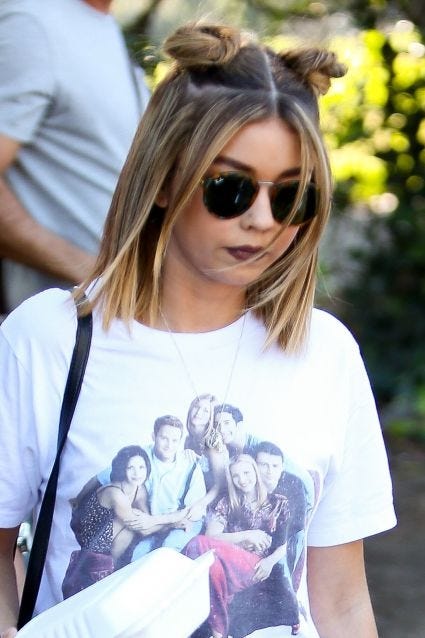 '90s babe! Sarah Hyland rocked straight hair, a middle part and two small top knots while out and about in Brentwood, California, on Nov. 3. Her purple pout and round-framed sunglasses amped up her edgy beauty look.
