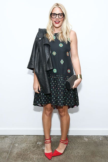 The mom of two looked quirky and cute in a playful sleeveless babydoll dress, which she paired with a black leather jacket, oversized glasses, and red ankle-tie suede heels for the Vince Camuto Holiday Dance Party in Los Angeles on Dec. 6.