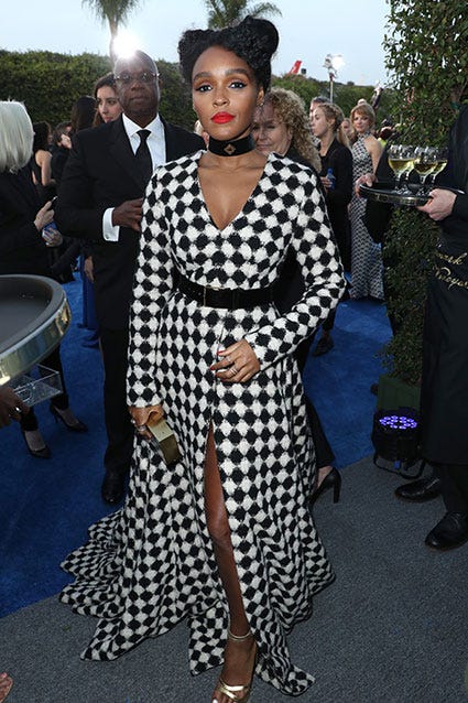 We're in love with the white-and-black diamond-print dress Monae rocked to the Critics' Choice Awards, which she accessorized with gold sandals, a thick black choker and matching belt. She finished off her look with two high buns and bold red lips.
