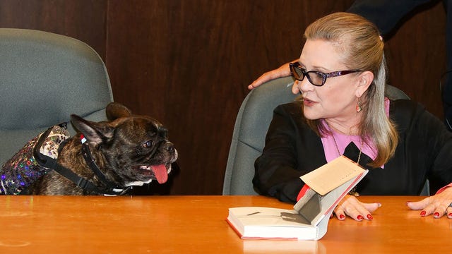 The French bulldog sat by Fisher's side as she signed copies of her latest memoir, The Princess Diarist, at Barnes & Noble at The Grove in Los Angeles on Nov. 28, 2016.