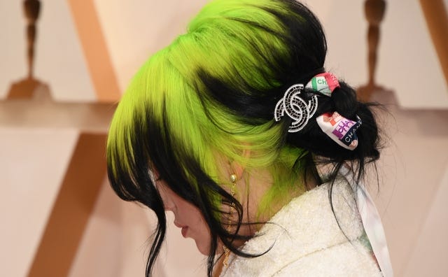 Not only was the "Bad Guy" singer's suit covered in Chanel logos at the 2020 Oscars, so was her neon green-and-black updo, which featured a hairpin with the iconic locked double C and a scrunchie baring the fashion house's name.