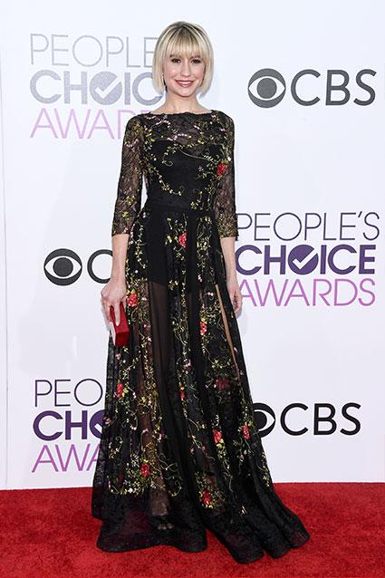 Lovely in Lace! The 33-year-old actress was all smiles on the People's Choice red carpet, sporting a beautiful Martha Medeiros dress, which she accessorized with an Edie Parker clutch.