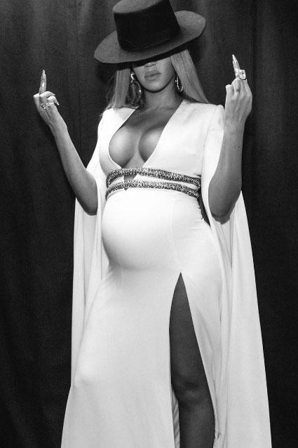 If you look beyond those NSFW middle fingers, you'll notice a very low-cut white dress that features a cape and thigh-high slit, which Bey paired with a double belt, hoop earrings, jumbo cocktail rings and a black hat.