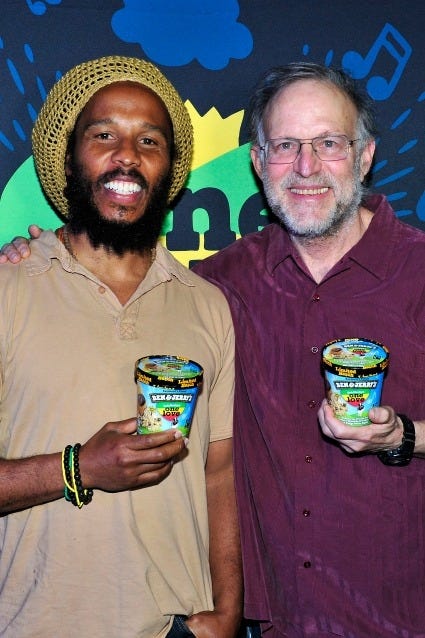Marley and Jerry Greenfield, co-founder of Ben & Jerry’s, celebrated the launch of the ice cream brand’s new One Love limited batch flavor available at Scoop Shops and retailers nationwide in Los Angeles at the Roxy Theatre.