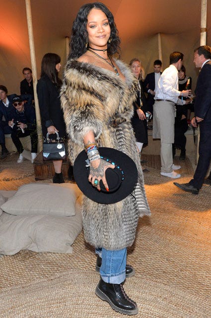 The "Work" singer looked ready to take on the Wild West in her hat and fur coat at the Christian Dior Cruise 2018 Show at Gladstone's on May 11 in Malibu, California.