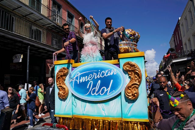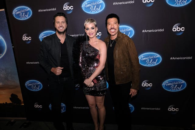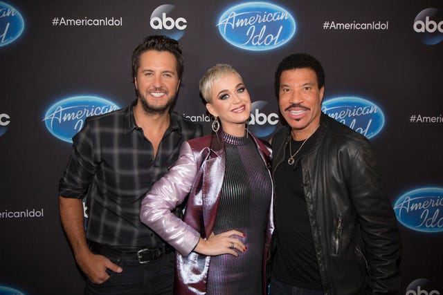 Flanked by her fellow Idol judges, Luke Bryan and Lionel Richie, during a round of auditions, Katy opted for a pink metallic blazer, two-toned, shiny striped dress and silver circular earrings.