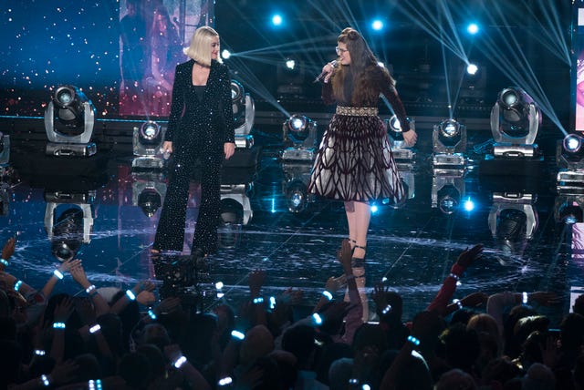 For the performance finals, the blonde bombshell looked ready to party in Palm Springs in a very '60s-esque feathered-and-beaded duster, baby blue blouse and matching wide-leg pants, which she paired with a winged bob.