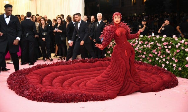 The rapper brought all the drama in a deep red Thom Browne gown with lengthy train and matching head cap.