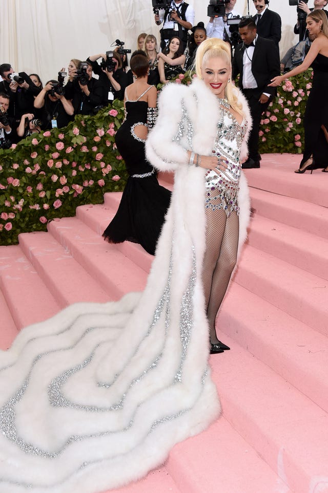 The No Doubt frontwoman was on a silver streak, topping an itty bitty, gem-encrusted Moschino corset with a sequin-lined white fur coat. She added plenty of bling with a stunning diamond necklace, then finished off her look with a high ponytail, red lip, fishnet stockings and black pumps.