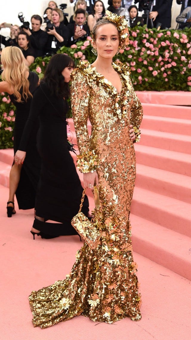 Gold was a major trend at the 2019 Met Gala, and Blunt wore one of the best gilded looks. Her sequined Michael Kors Collection stunner featured long sleeves, a mermaid tail and a plunging neckline, and even her purse and headpiece were in the identical fabric.