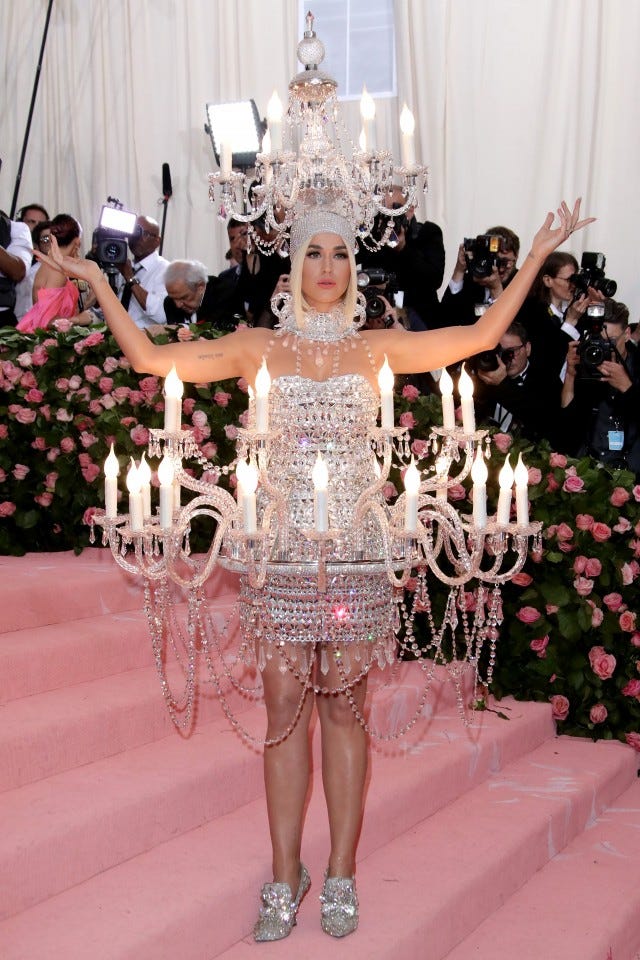 From fireworks to candelabras! We have no idea how she sat down in this, but the American Idol judge lit up the night in a Moschino dress outfitted to look like a chandelier.