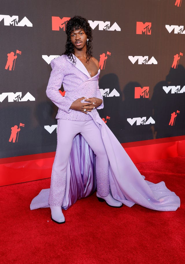 Lil Richard would be proud! The "Industry Baby" rapper was lovely in lavender, strutting his stuff down the red carpet in a light purple pantsuit-dress hybrid Atelier Versace outfit with a long asymmetrical train and sculptured shoulders. He completed the look with matching shoes and a Jheri curl 'do.