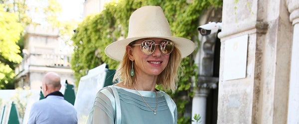 The actress arrived in Italy for the 75th Venice Film Festival wearing a pretty pale teal maxi, white tote and tall straw hat.