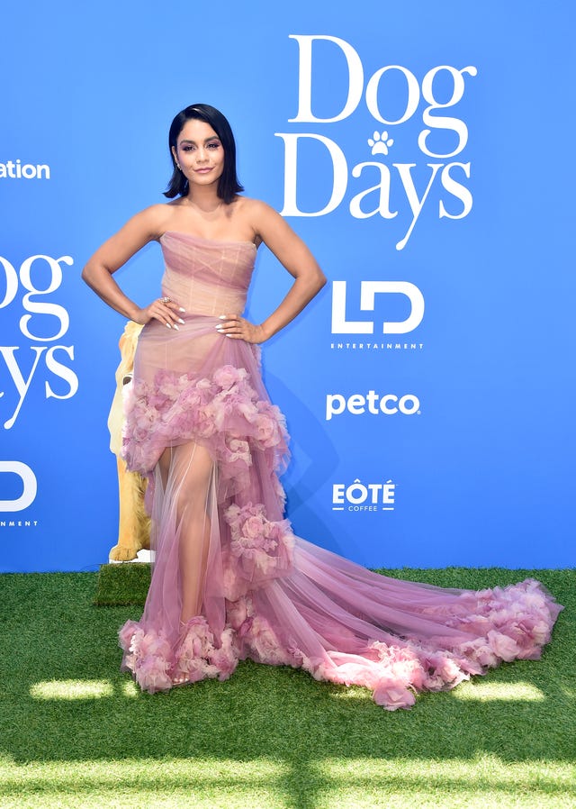The raven-haired beauty brought the drama in a romantic strapless purple Marchesa tulle gown with floral embellishments at the Dog Days premiere.