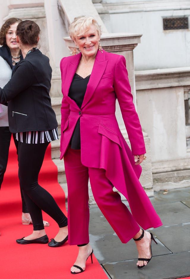 The acting legend was a knockout in a magenta pantsuit by Alexander McQueen and Christian Louboutin sandals at the London premiere of The Wife.