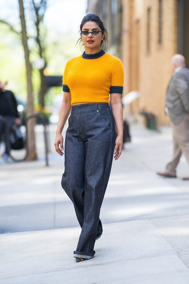 The Quantico star looked perfectly casual in a cropped sunflower yellow Ganni top with navy blue accents, cuffed high-waisted Frame jeans, Fendi heels and itty bitty Vogue X Gigi sunglasses while out in New York City's Upper East Side neighborhood.