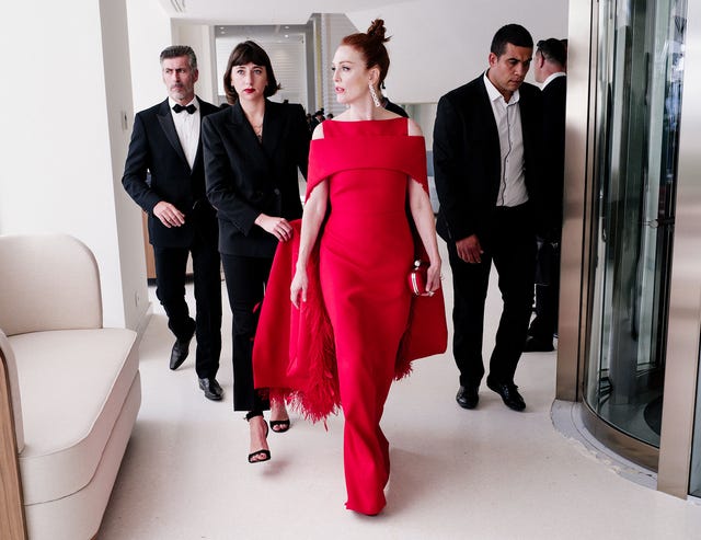 Moore looked flawless as she left the Martinez Hotel in France for the opening night gala of the 71st Annual Cannes Film Festival, strutting her stuff in a unique red Givenchy dress complete with cut-out shoulders and a feathered cape, which she accessorized with Chopard diamond drop earrings.