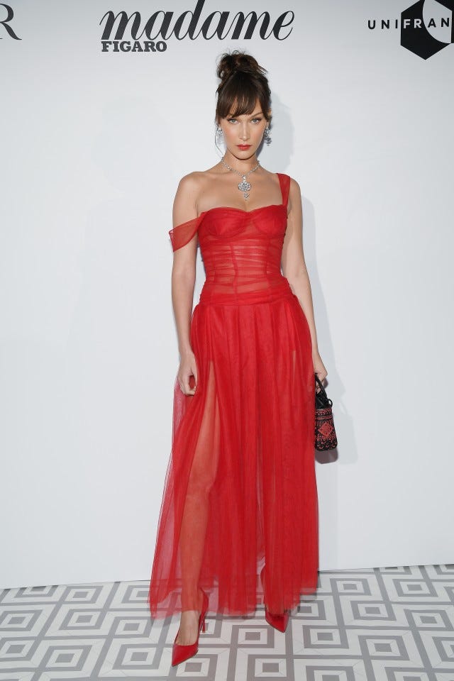 So romantic! We love how Hadid styled the straps of this semi-sheer, fire engine red dress at the Dior dinner during the 71st Annual Cannes Film Festival, pairing the look with matching pointy pumps, a heart-adorned black striped mini bag and a diamond necklace. She finished off the look with her hair in a high, loose bun and a bold red lip.