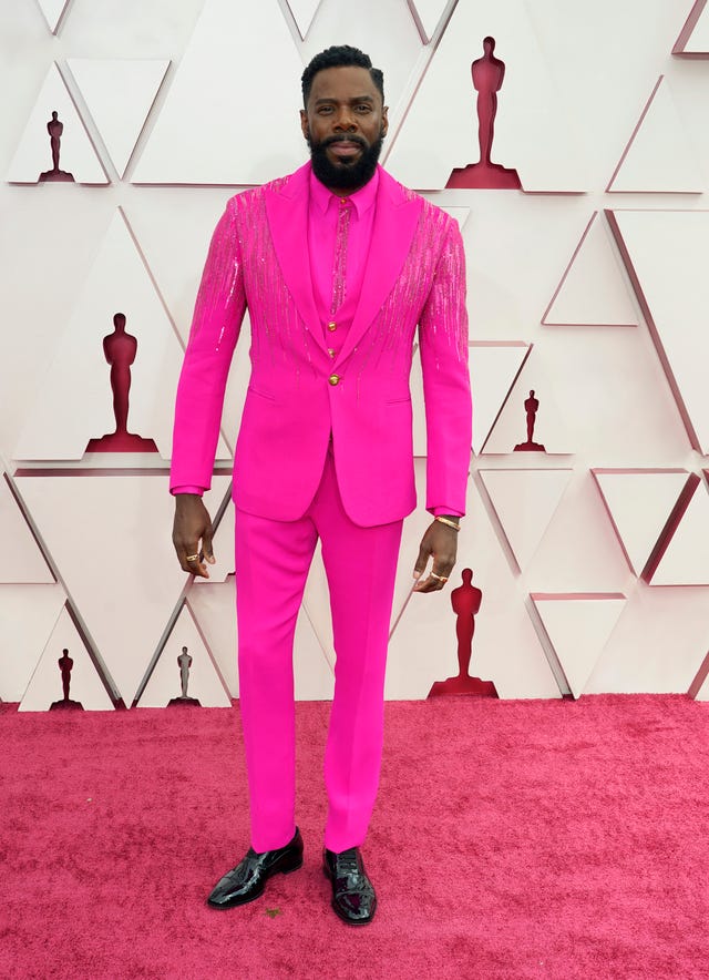 The Ma Rainey's Black Bottom actor stood out at the Academy Awards, thanks to his bright fuchsia Versace suit. According to his Instagram, his Oscars outfit featured 4,500 precious Swarovski crystals and sequins and took an impressive 150 hours of embroidery work to complete.