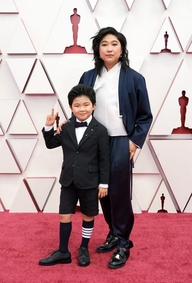 Alan Kim, 9, is seen here in a school uniform-inspired custom Thom Browne look. The pint-sized Minari actor was joined on the red carpet by the film's producer, Christina Oh.
