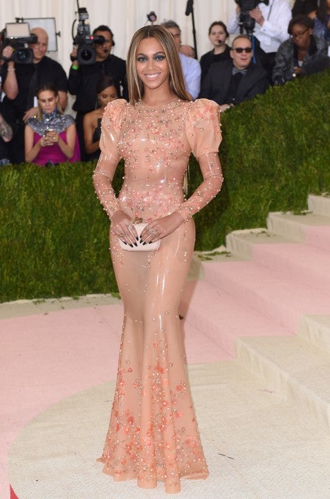 in a peach latex Givenchy dress at the 2016 Met Gala.
