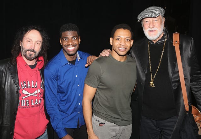 Legendary musicians Mike Campbell and Mick Fleetwood pose with Ain't Too Proud - The Life and Times of The Temptations actors Jawan M Jackson and Derrick Baskin backstage at The Imperial Theatre after a performance of the hit musical.