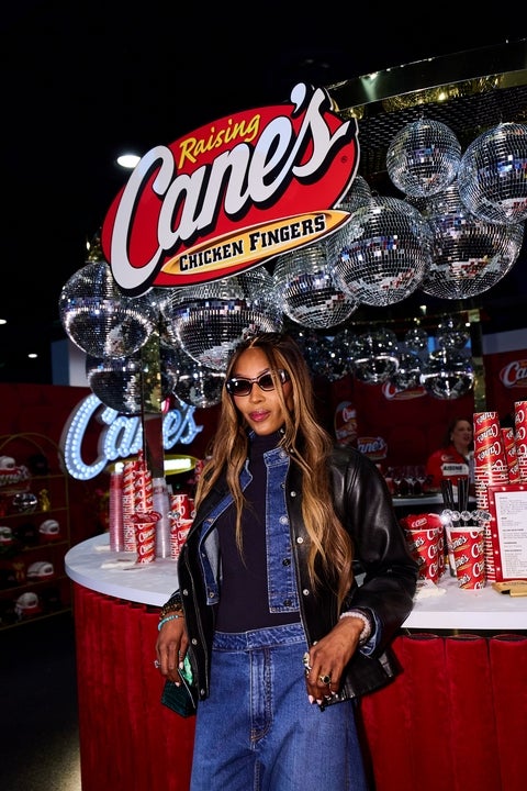 The model strikes a pose at the Raising Cane's Paddock Club Suite on Nov. 22 at Formula 1 Las Vegas Grand Prix in Las Vegas, Nevada.