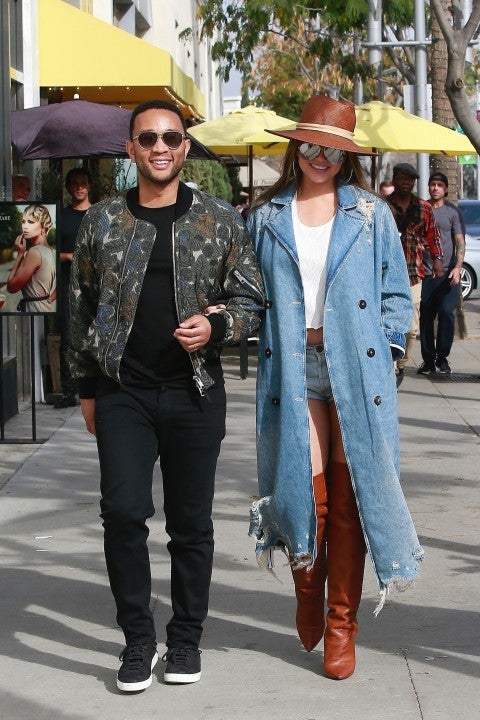 For her lunch date with husband John Legend at Beverly Hills' Il Pastaio on Jan. 15, Teigen donned a cowgirl-inspired ensemble that included a long light denim coat, brown hat, white T-shirt, itty-bitty light-wash denim shorts by ONE TEASPOON and thigh-high cognac boots.