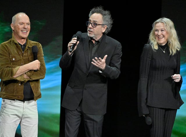 Michael Keaton, Tim Burton and Catherine O'Hara speak onstage during the Warner Bros. Pictures presentation during CinemaCon 2024 at The Colosseum at Caesars Palace on April 9 in Las Vegas, Nevada.