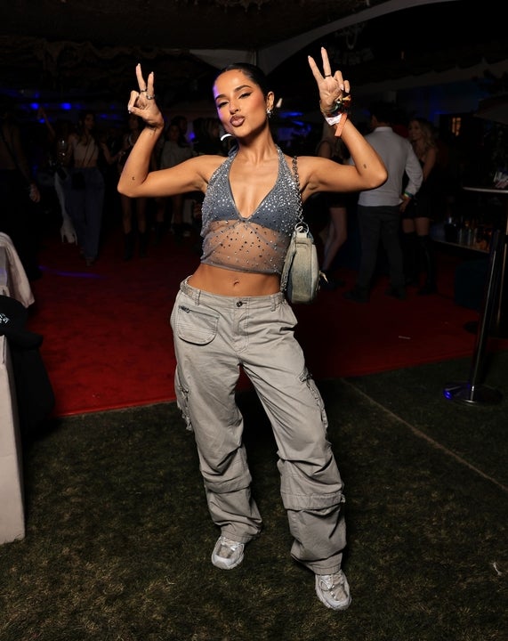 The singer holds up peace signs at the REVOLVE and PIZZASLIME afterparty following REVOLVE's 8th Annual REVOLVE Festival on April 12 in Thermal, California.