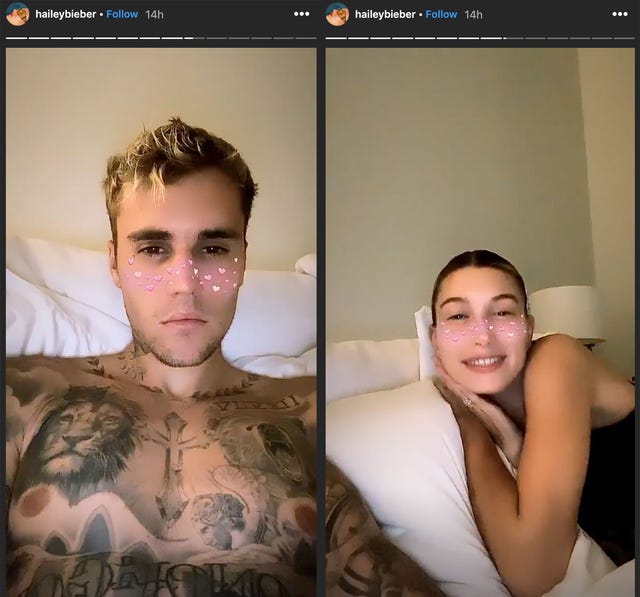 The model and her husband, Justin Bieber, have been playing with Instagram Story filters from the comfort of their bed.