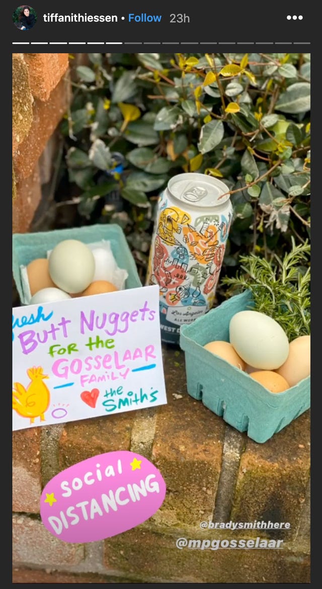 The actress dropped eggs off at Saved by the Bell pal Mark-Paul Gosselaar's home, leaving them outside his gate.