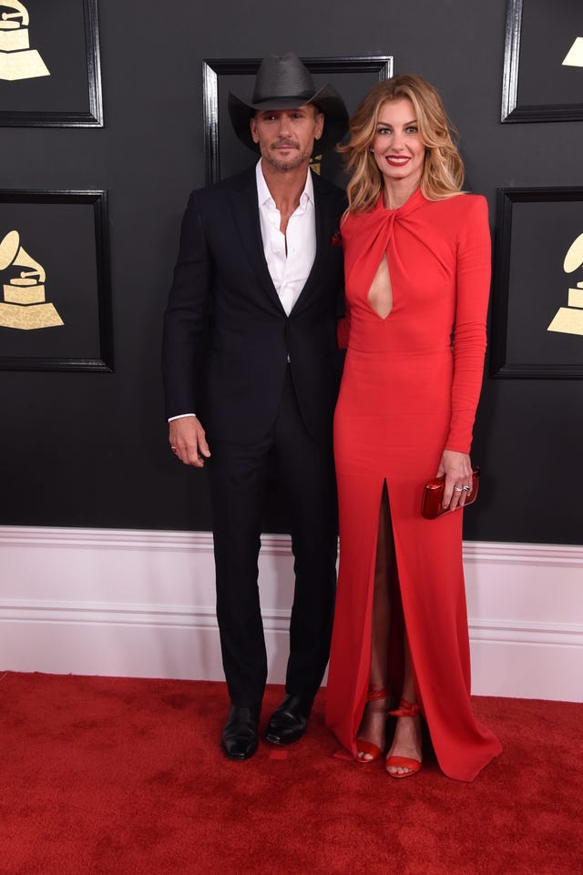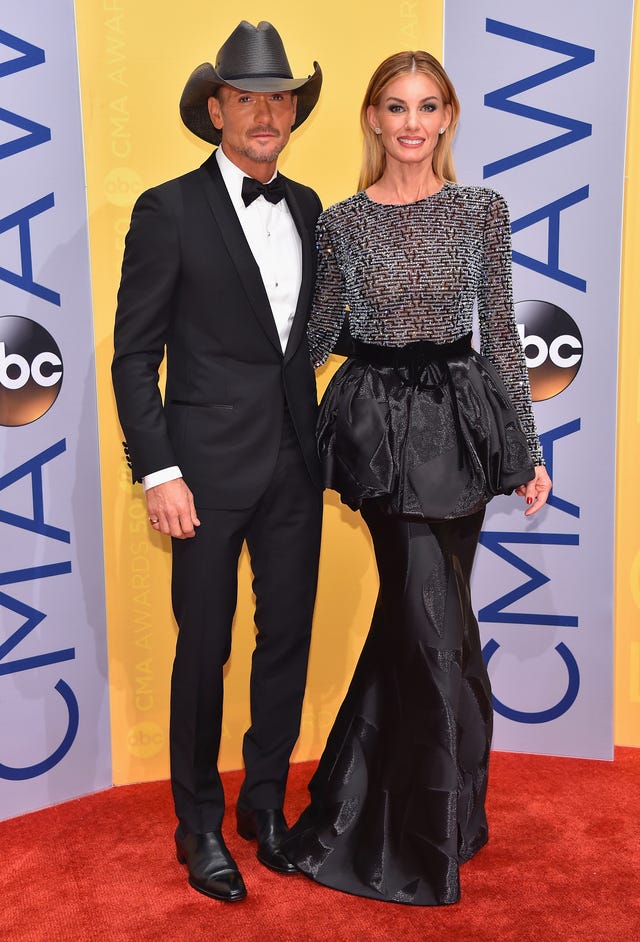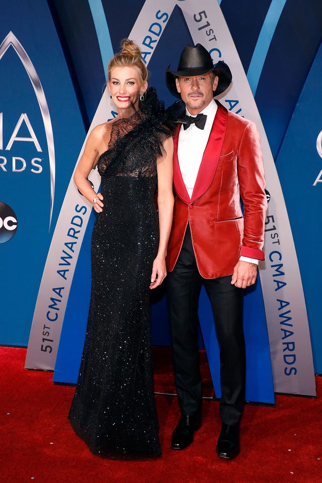The country music couple got all spruced up for the 2017 CMA Awards in Nashville, Tennessee. The songstress, who was nominated for Musical Event of the Year, wore a one-shouldered black-beaded Armani Privé gown. McGraw went with a red velvet suit jacket and accessorized the look with a black cowboy hat.