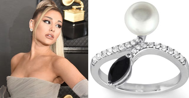 The “Positions” singer Instagrammed a pic of her diamond and pearl engagement ring after her fiancé, Dalton Gomez, proposed. The 5-carat oval diamond is nestled next to a gorgeous pearl that fans speculate could be related to the meaningful ring Grande got from her grandmother several years ago. Shopping for a two-stone ring that’s as unique as Ari’s? Jared sells a cultured pearl ring that features an onyx stone on a sterling silver band.