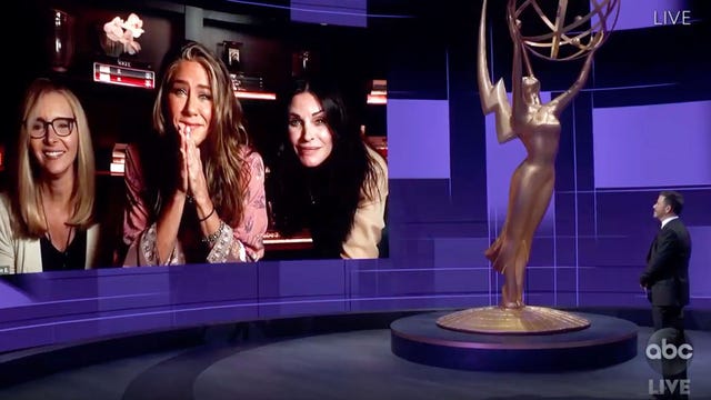 After helping Jimmy Kimmel host the mostly-virtual Primetime Emmy Awards in 2020, Jennifer Aniston retired to her home, where she watched the rest of the show with Friends roomies Courteney Cox and Lisa Kudrow. Oh, and of course their bonus roommate Jason Bateman.
