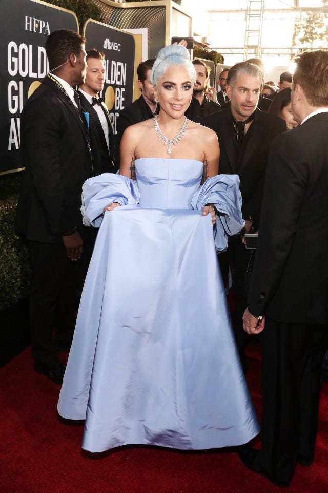 As expected, the pop star-turned-actress owned the red carpet, delivering all the glamour in a voluminous periwinkle blue Valentino couture gown, custom Giuseppe Zanotti boots and dripping in over 100 carats of Tiffany & Co. diamonds. Gaga, who is nominated for Best Actress in a Motion Picture -- Drama for her performance in A Star Is Born, already took home the award for Best Original Song for the film's hit, "Shallow."