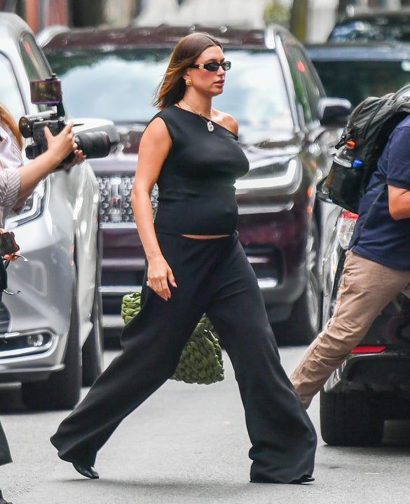 Hailey Bieber shows off her growing baby bump in a one-shoulder black top and black pants while out in New York City.