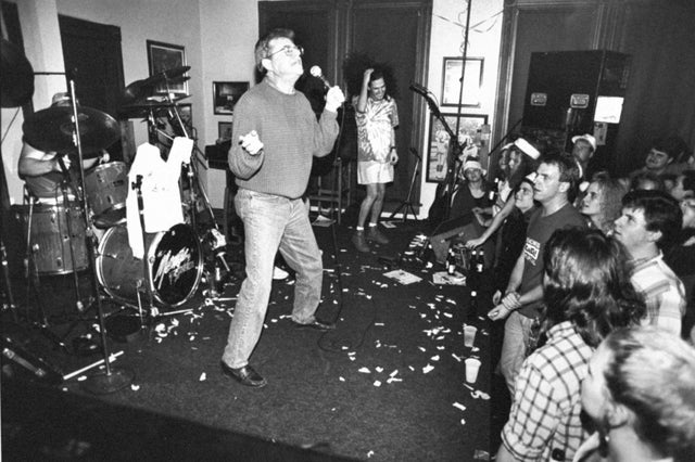 Jerry Springer stands performs with The Menus in the Tickets Sports Bar.