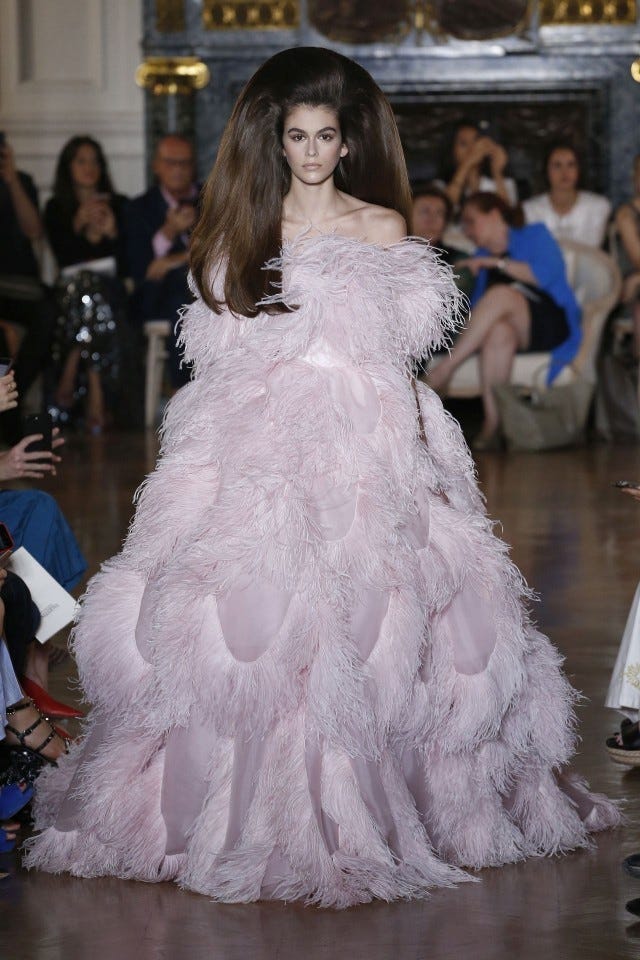 Gerber wore a show-stopping fuchsia creation during the Spring/Summer 2018 Valentino Haute Couture fashion show at the Hotel Salomon de Rothschild in Paris, France, on Jan. 24. The Paris Fashion Week ensemble was paired with sheer black tights and gold heels that featured a single strap across the toes and ankle.