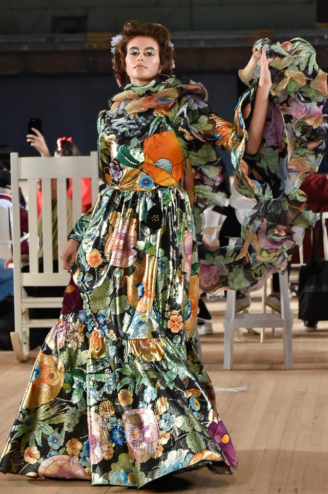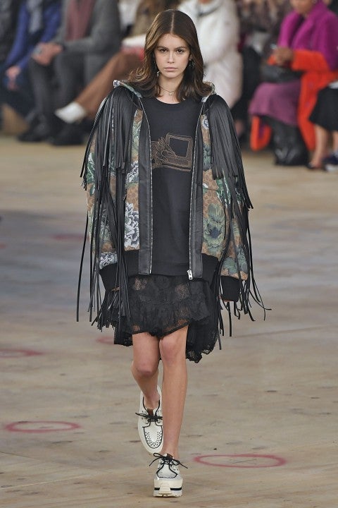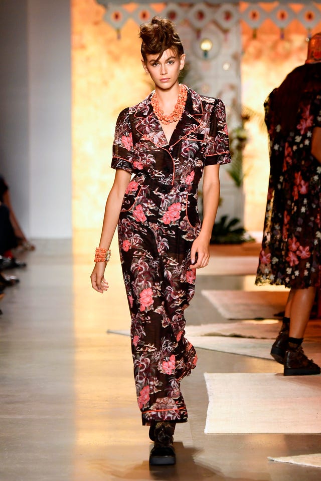 Giving us major '70s nostalgia, Gerber rocked a black sequin dress with a flowy peach floral print top at the designer's NYFW runway on Feb. 12.